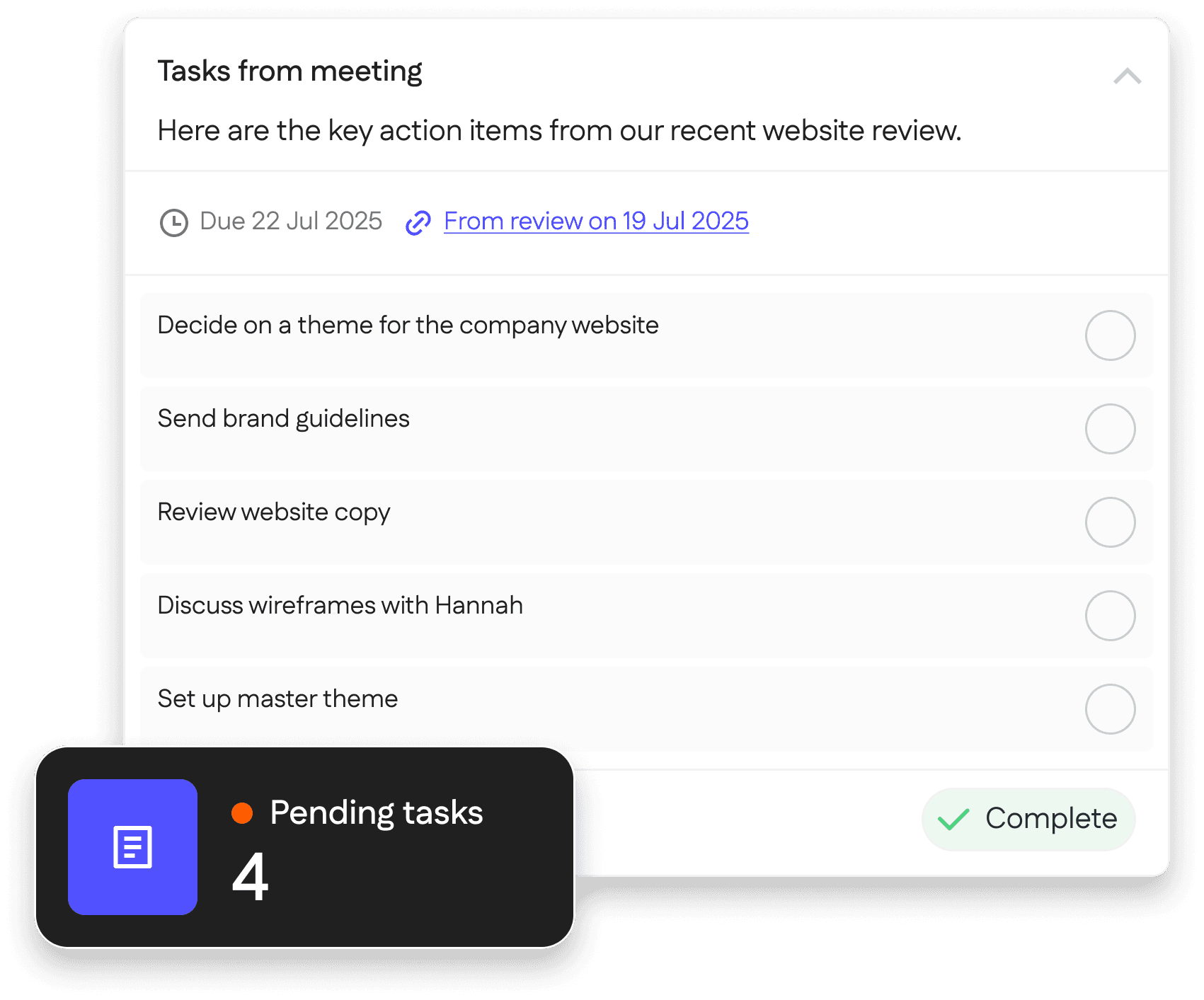 Get your most recent tasks listed on your dashboard, taken from meetings, emails and transcripts.